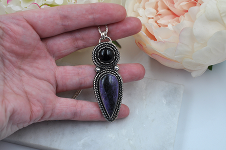 This black onyx and charoite two-stone stunner is set in sterling silver with the stones being surrounded by intricate metal work. There is a combination of twisted rope and sphere details that pull the piece together. This long pendant looks great on a longer necklace and could easily be layered with a shorter necklace creating an even more unique look. While this comes on a longer necklace, it would still look great on a shorter chain.