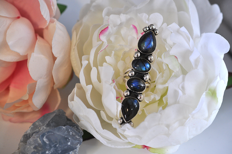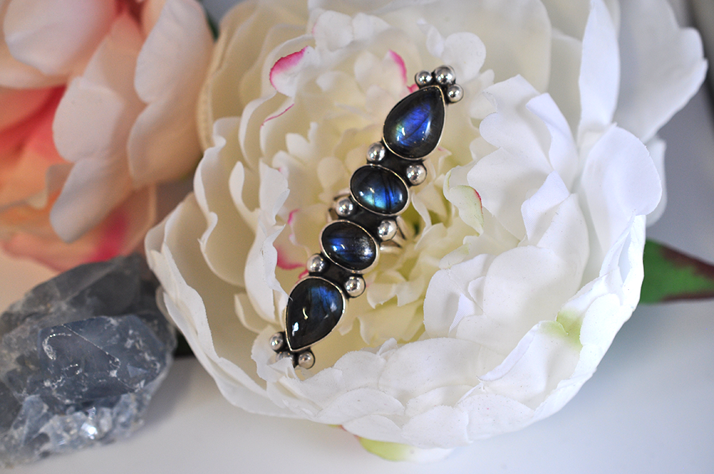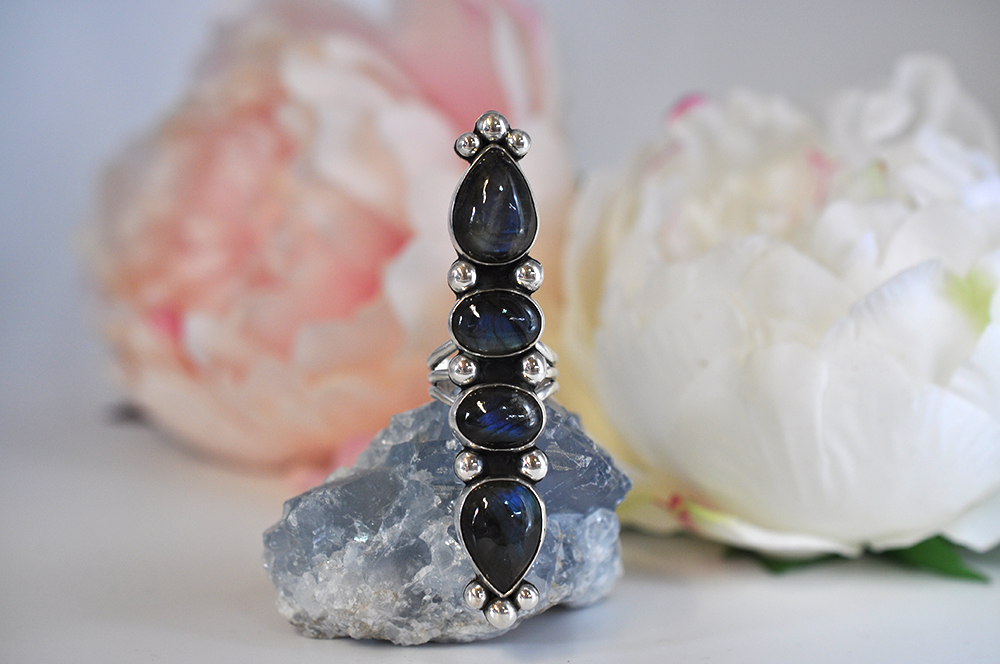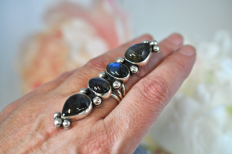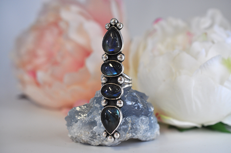 Big. Bold. Bright. Flashy Blue Labradorite. This ring makes a statement. Featuring four labradorite stones set in a sleek silver setting with accent spheres creating shiny pops of silver. This ring will appear to elongate your fingers. While being long and measuring right at 3 inches in length, this ring is surprising comfortable and easy to wear.