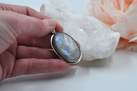 Flashes of blues and purple cascade the surface of this undeniably beautiful rainbow moonstone pendant. It shimmers and shifts in the light. This bold colorful moonstone is set in a decorative setting and antiqued to accentuate the colors. It can be worn with just about anything in your closet.