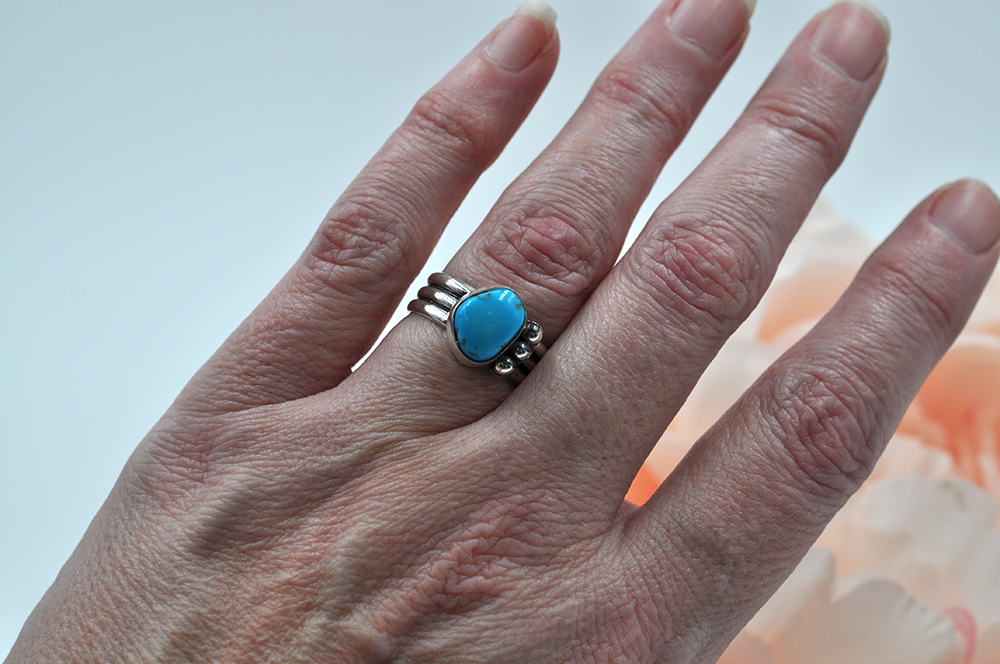 This ring features a natural Morenci turquoise stone from the mine located in Morenci, AZ. The turquoise from this mine is known for its bright blue color, pyrite inclusions and beautiful water webbing. Today this classic turquoise is considered rare and hard to find as this mine has been closed for many, many years and ceased mining for turquoise in 1984.
