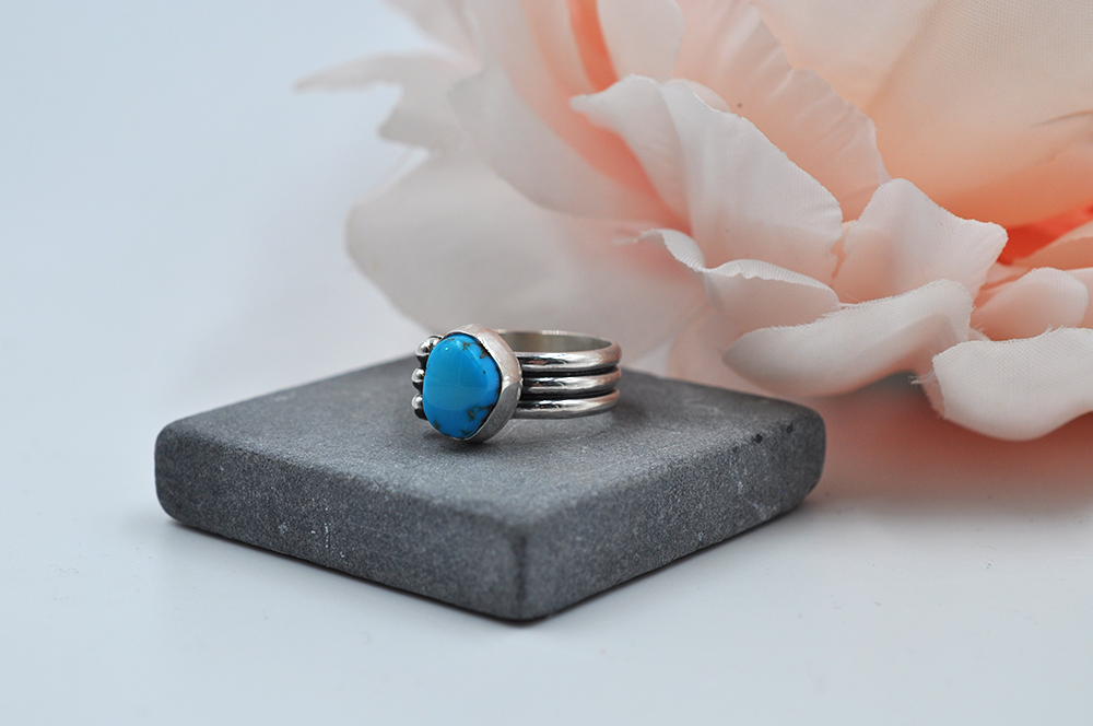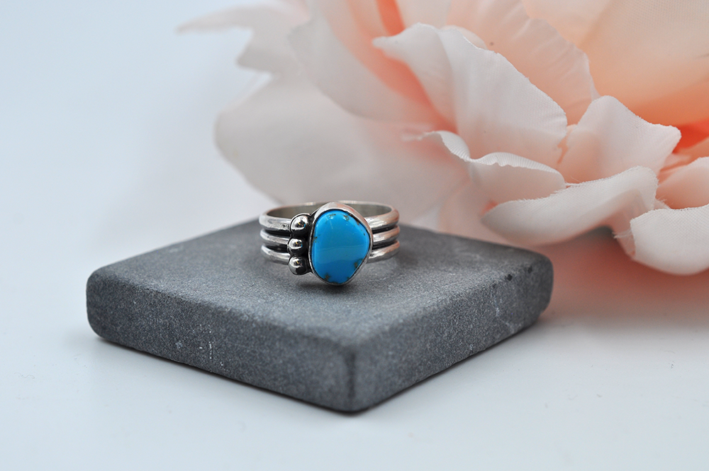 This sky blue Morenci turquoise stone is a stunner. This stone is complimented by a triple half round sterling silver ring band and three silver accent spheres. Its unique freeform shape creates a point of interest with an intense pop of blue. If you're a lover of turquoise then this rare gem is for you.