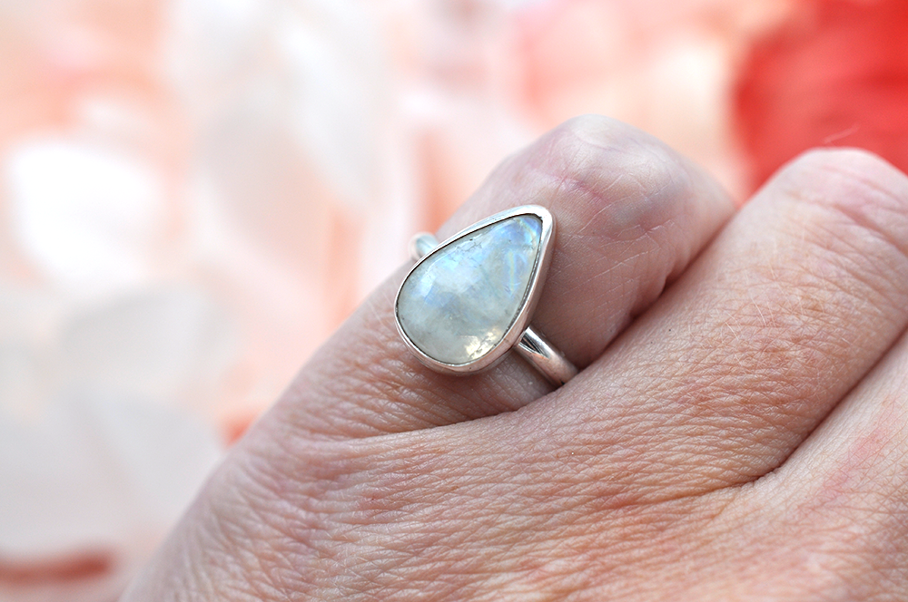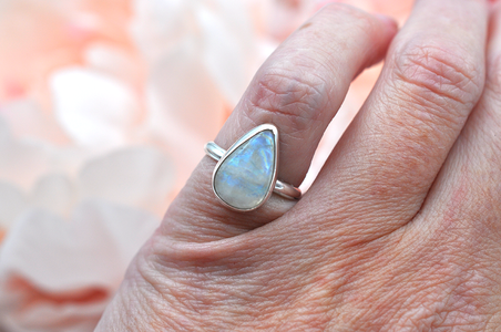 Looking for a ring that literally goes with every outfit, then rainbow moonstone is your stone. This teardrop moonstone has a bright purple and blue flash depending on the angle at which the light is hitting the stone. The design is simple and minimalistic. The small ring size makes this perfect for someone with small fingers. Comfortable and can easily be worn daily.
