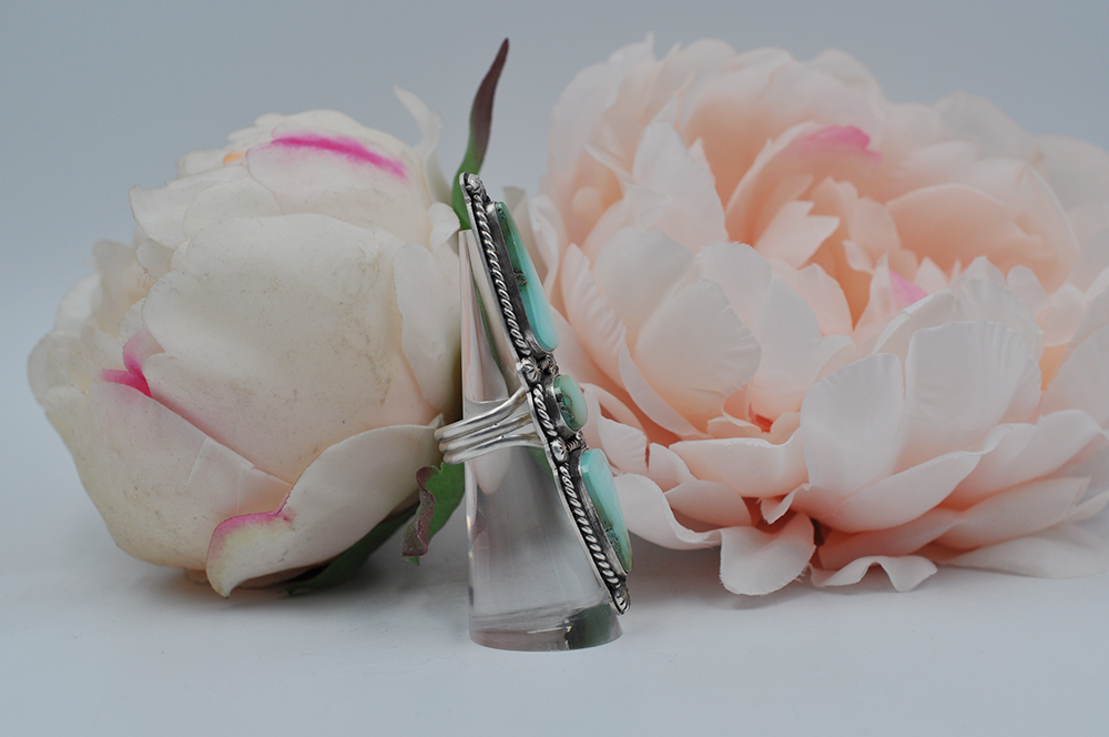 These dreamy pale green Natural Royston turquoise stones draw in your attention and hold it in this stunning three stone statement ring. Set in a brush finished sterling silver it helps draw attention to the natural beauty of the stone. These light green turquoise blanks as they are referred to are not all that common to find. Royston turquoise tends to have webbing that runs throughout, blanks do not.